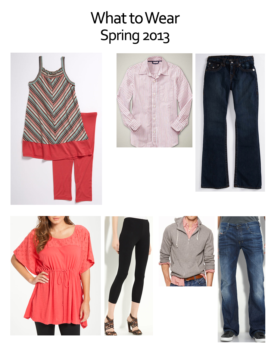 I LOVE color! Â Don’t be afraid to go bold, bright, or choose stripes or plaids for one or two of your outfits. Â I do advise to stay away from screen print tee shirts or large logos. Â Here are 2 examples of how you can mix and match your family’s wardrobe with one or two color direction. Â First example is a pretty dark coral color, which is seen in all 4 outfits. Â Second example, we added 2 main colors, turquoise and grey, and added denim and white to round it out.
